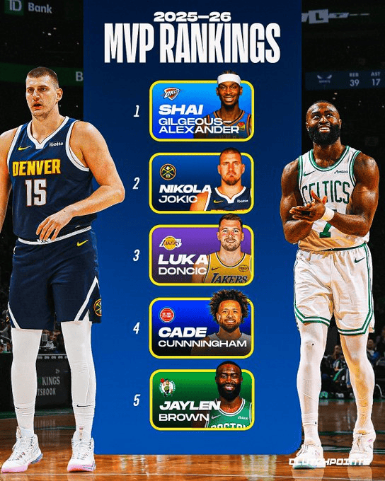 CP晒目前MVP榜:SGA、约基奇、东契奇前三,杰伦-布朗第五