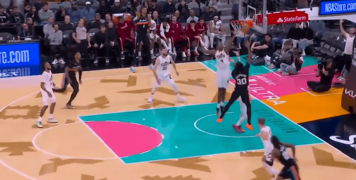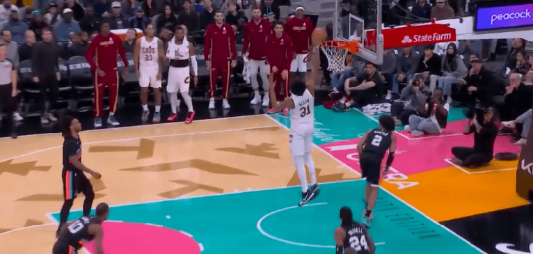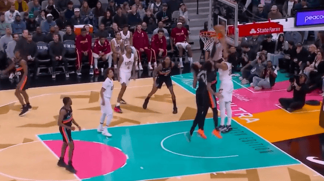 阿伦篮下迎着文班亚马尚帕尼单臂隔扣,骑士领先马刺12分