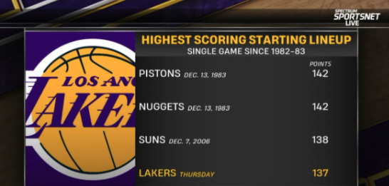 湖人首发五人今日共得137分,1982-83赛季至今第四支球队