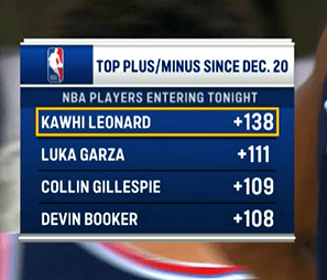 12月20日至今正负值:小卡+138第1、加尔扎第2、吉莱斯皮第3