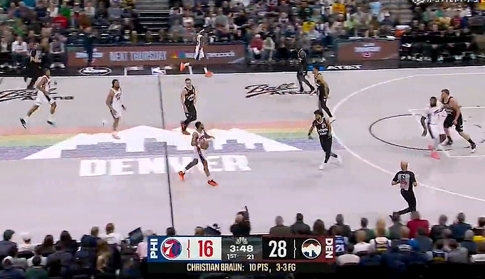 虎扑布劳恩3中3得到10分,掘金已经领先76人15分