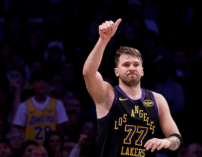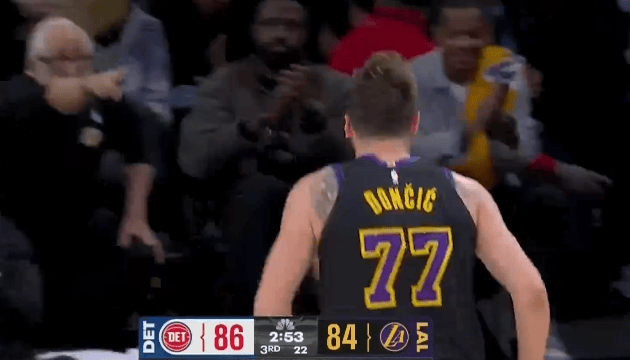 东契奇撤步强拔三分投进砍下30分,湖人追至落后活塞2分