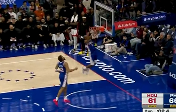 马克西抢断杜兰特后双手暴扣,半场76人68-61领先火箭