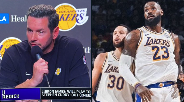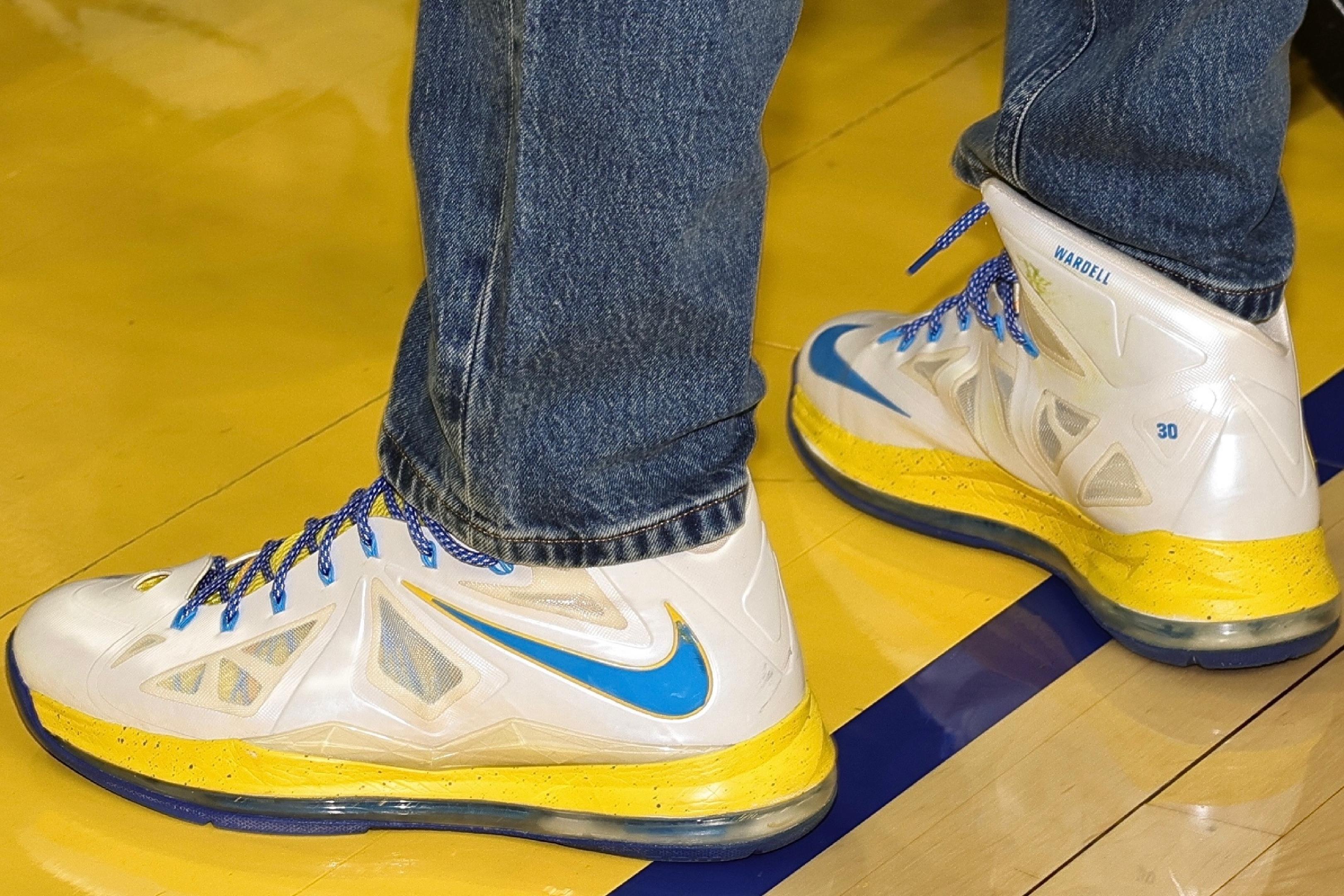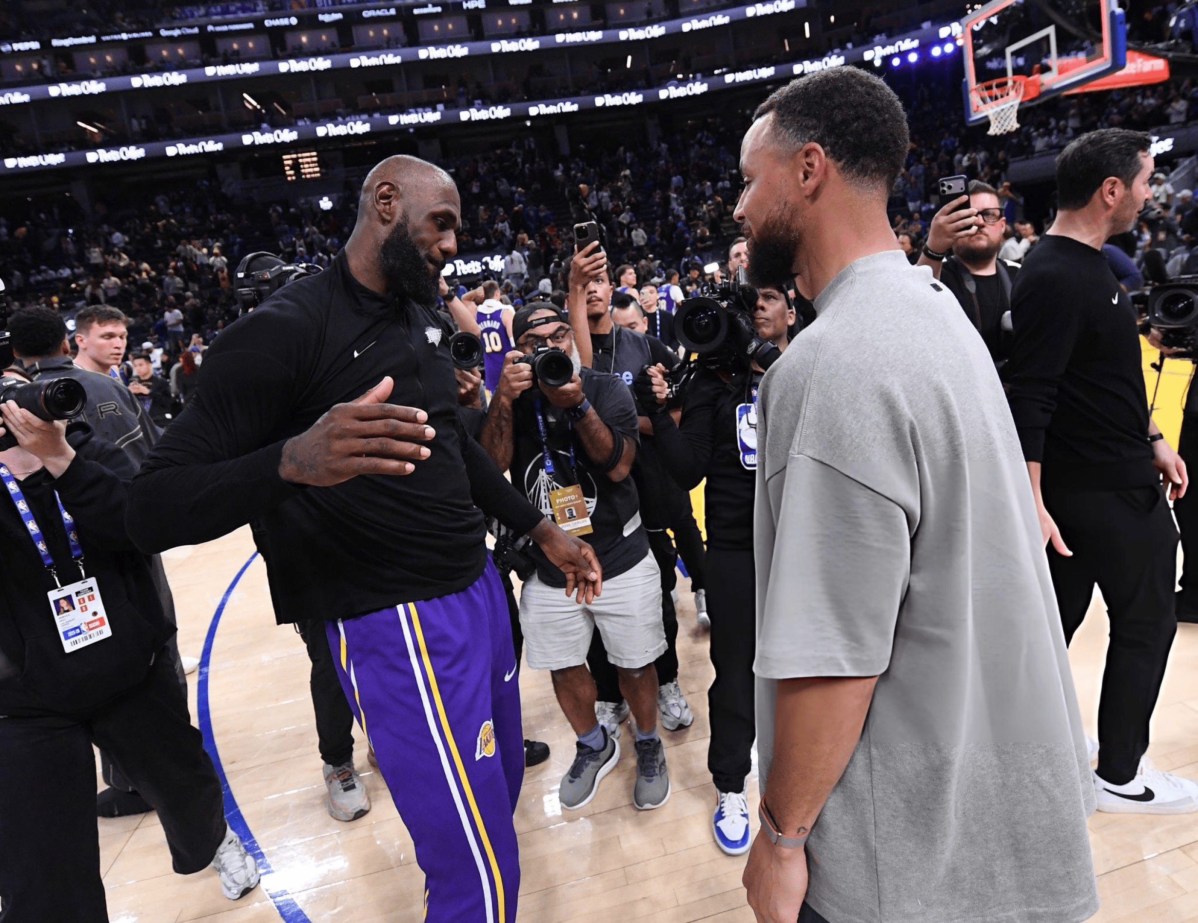 致敬老詹和曾经的自己!库里穿着勇士配色Lebron10场边观战