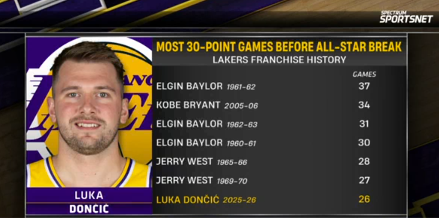 东契奇本赛季全明星赛前已26次砍下30+,排名湖人队史第七