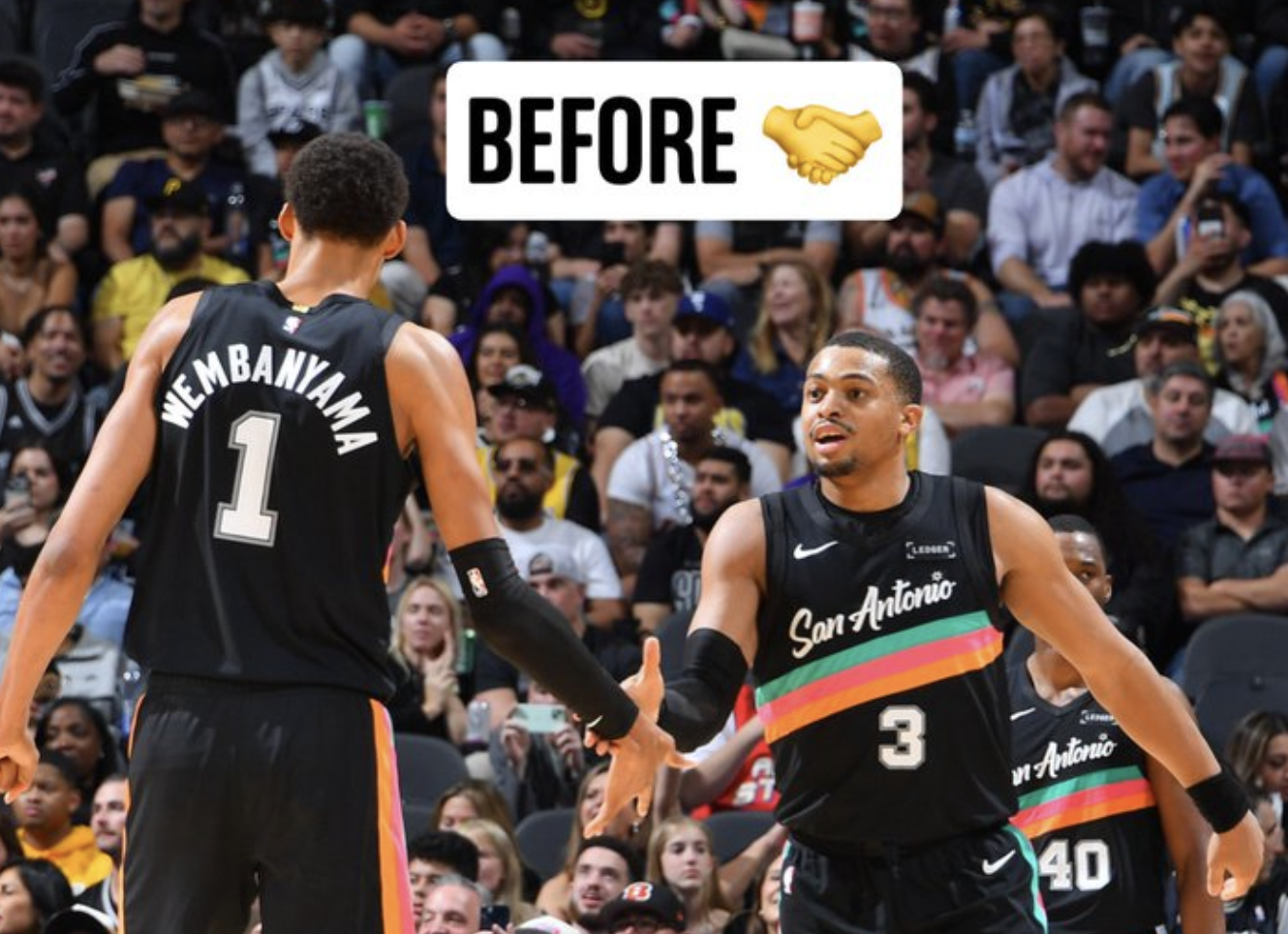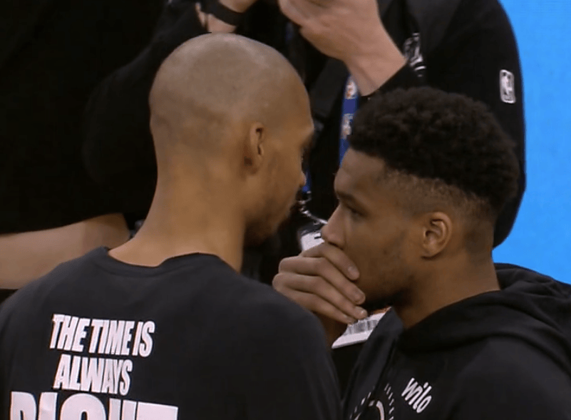 聊啥呢?比赛结束后,字母哥捂嘴与文班亚马沟通