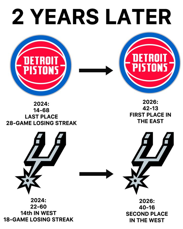 美媒:活塞和马刺2个赛季前分别遭遇了28连败和18连败
