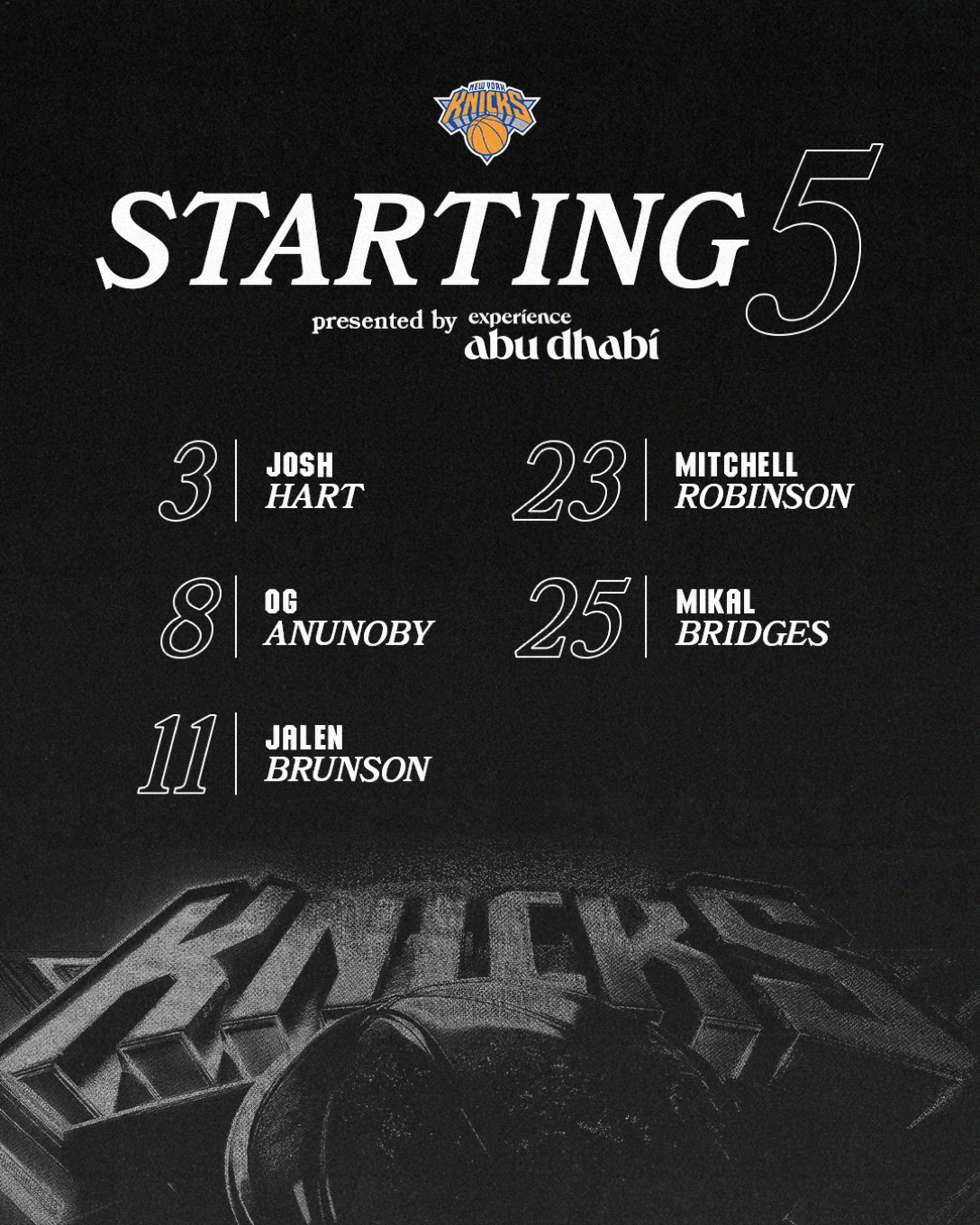 尼克斯首发:哈特、OG-阿奴诺比、布伦森、布里奇斯、米罗