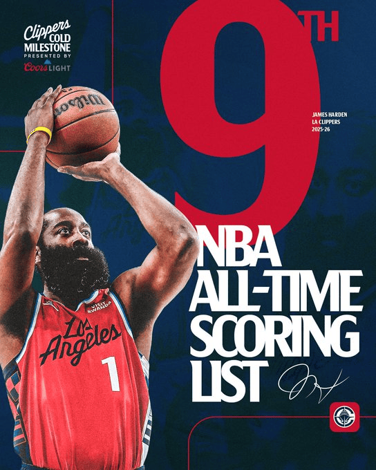 哈登本场砍下32分10助攻,队史仅保罗比他拥有更多的30+10助