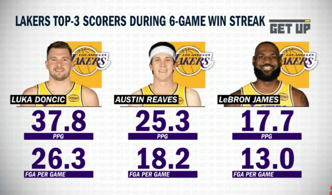 东契奇6连胜场均爆砍37.8分、里夫斯25.3分、詹姆斯17.7分