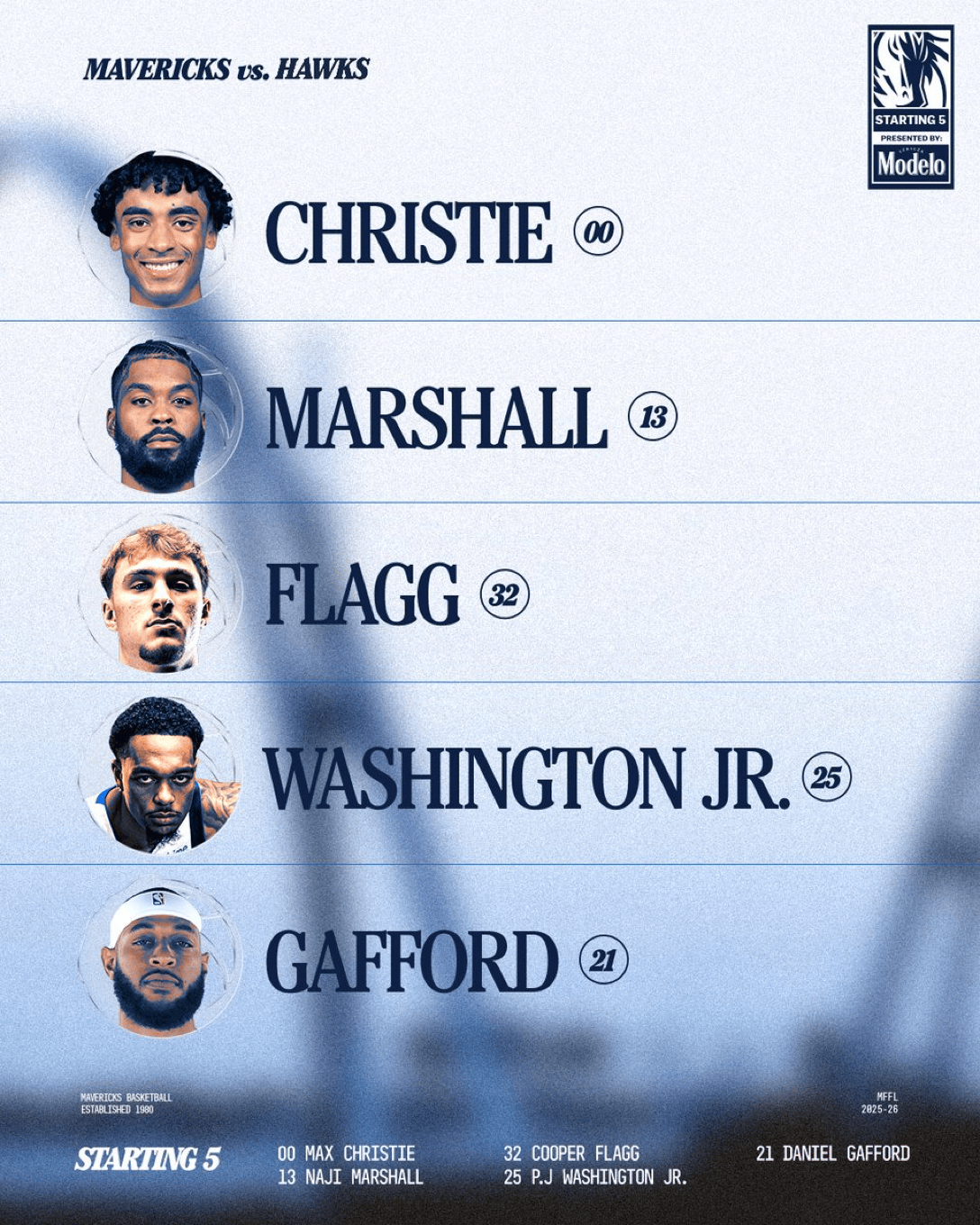 独行侠首发:克里斯蒂、马绍尔、弗拉格、华盛顿、加福德