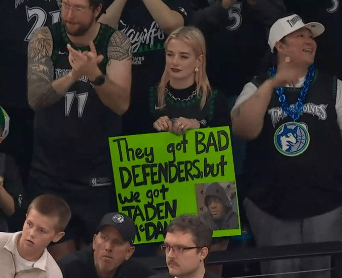 森林狼球迷举牌:掘金全是不会防守的球员,但我们有麦丹