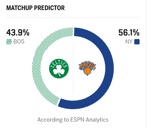 虎扑 5回复ESPN预测明日比赛:凯尔特人胜率43.9%,尼克斯胜率56.1%