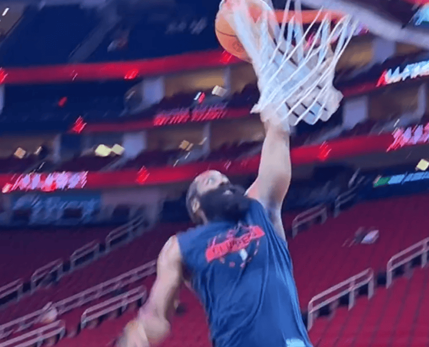 回到熟悉的场地!哈登在赛前热身上演单臂暴扣