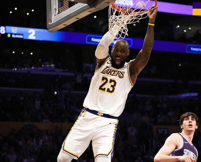 湖人官方晒照:里夫斯单手抛向天空,詹姆斯双手完成灌篮