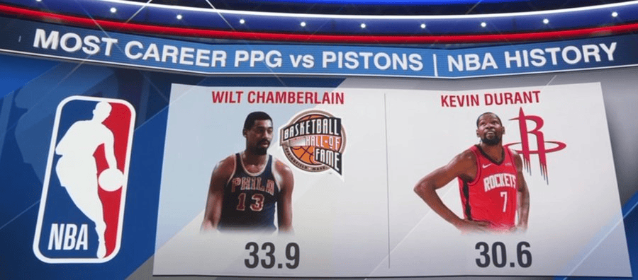 历史对阵活塞最高场均得分球员:张伯伦33.9分&杜兰特30.6分
