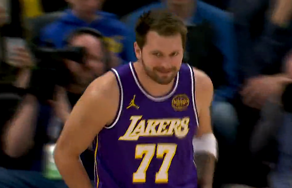 东契奇本场比赛首次出手三分命中,露出诡异微笑