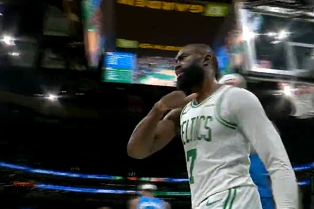 炸裂!杰伦-布朗转身过掉卡鲁索和SGA,迎着杰林单臂隔扣