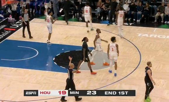 兰德尔翻身后仰不中,火箭首节以19-23落后森林狼