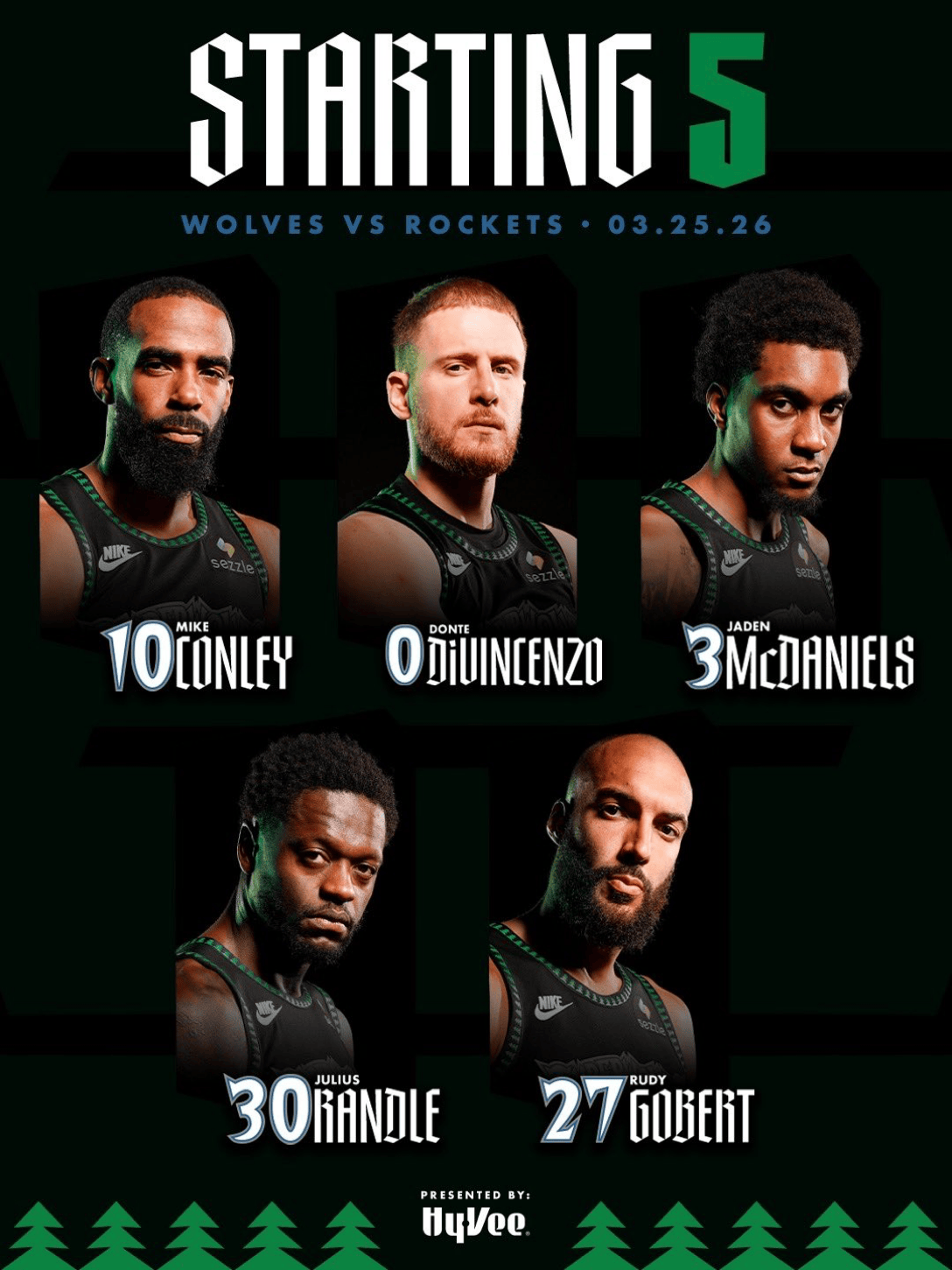 森林狼首发:康利、迪温琴佐、麦丹、兰德尔、戈贝尔